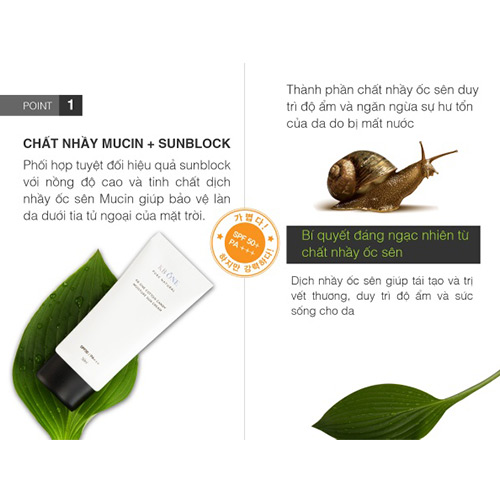 – Phối hợp tuyệt đối hiệu quả sunblock với nồng độ cao và tinh khiết chất nhầy Mucin từ ốc sên giúp bảo vệ làn da dưới tia tử ngoại của mặt trời
